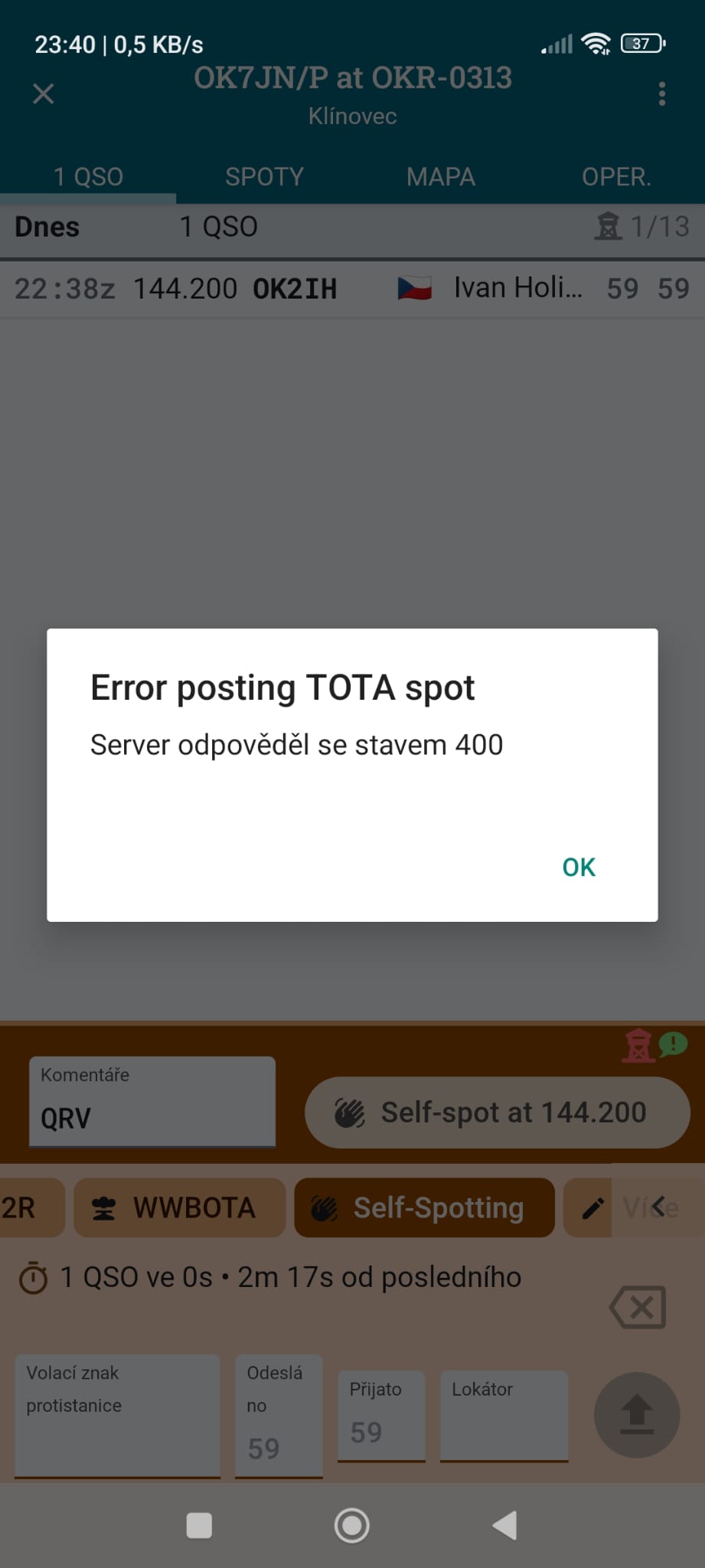 please help. Today when activating TOTA - Towers on the Air I found out that I can’t send spots - server error 400.