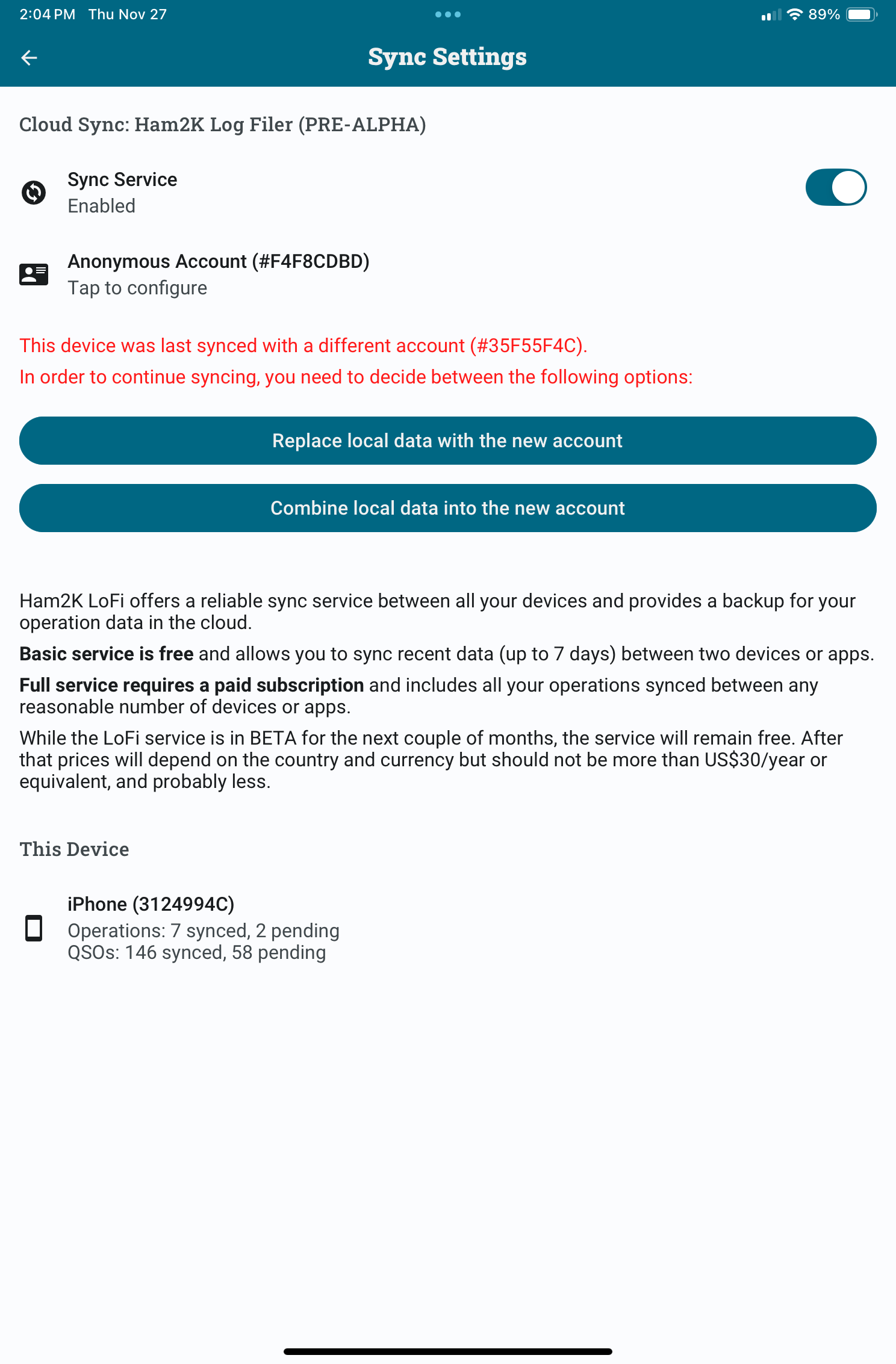 Good afternoon y’all! Yesterday I was playing around with syncing in the latest beta. Both devices are confirmed, iPhone 16 ProMax running latest public beta iOS 26 and iPad running iOS 18.5. On my iPhone I created a dummy log of a valid POTA activation but the activation isn’t showing on my iPad. Isn’t this what the syncing is supposed to do? I even reset sync status to force it to sync/download the logs on both devices but it’s still not showing on my iPad. Am I missing something?